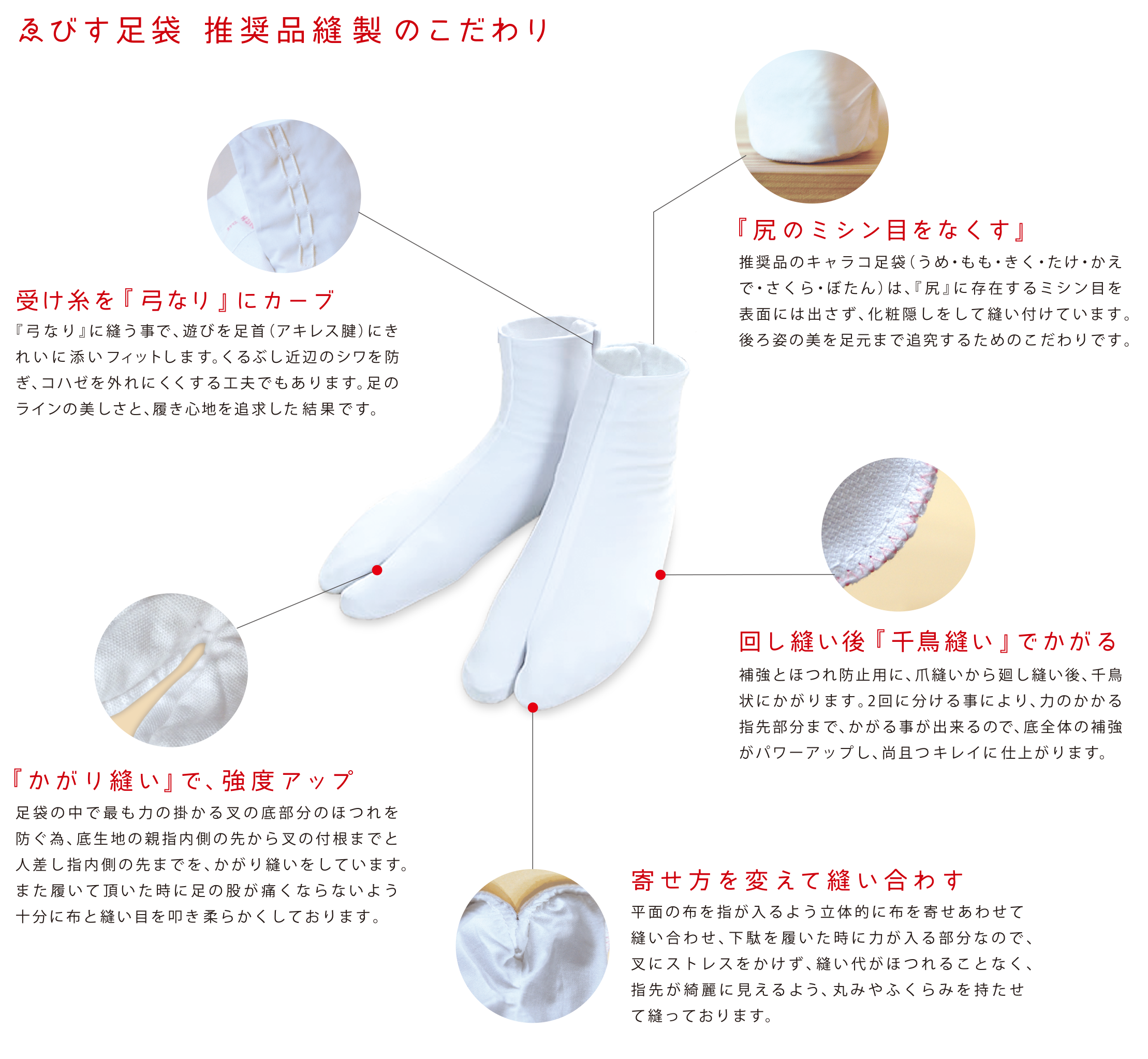 踵の左右の表地を繋ぎ止める"尻"のミシン目は表面からは見えないように隠して縫い付けています。この製法は、他社には見られないエビス独自の製法です。エビスの白キャラコ足袋、うめ、もも、きく、たけ、さくら、ぼたんの6種にこの製法を採用。後ろ姿の足元にまで美を追求するのエビスの美学です。